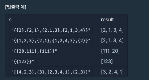- 예시 2의 문자열을 길이로 정렬하면 {2}, {2, 1}, {1, 2, 3}, {1, 2, 4, 3}가 된다. 이 때, 길이가 짧은 문자열에 담긴 원소부터 튜플에 담게 되면 가장 처음에는 2가 튜플에 들어오고 두 번째인 {2, 1}에서는 2가 이미 튜플에 존재함으로 1이 튜플에 들어오게 된다. 세 번째인 {1, 2, 3}에서는 튜플에 존재하는 2와 1을 제외한 3이 튜플에 속하게 되고, 마지막인 {1, 2, 4, 3}에서는 튜플에 존재하지 않는 4가 튜플에 들어오게 된다.