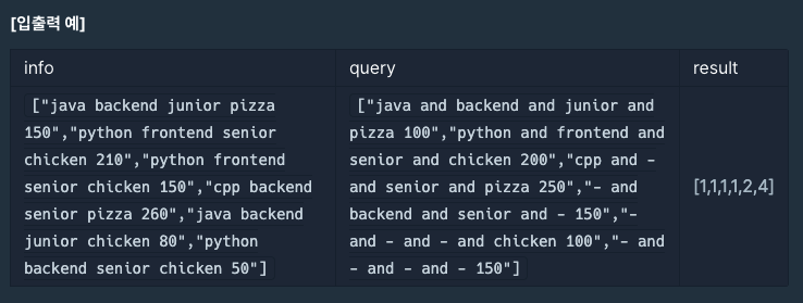- 조건의 경우 해당 조건으로 만들 수 있는 다른 조건들을 모두 만든다. 이 때, python의 itertools.combinations를 사용해서 '-'로 바꿀 경우를 만들어준다. 그리고 동일한 조건을 key로 점수를 value로 한 딕셔너리를 만든다. 이를 통해 query에서 주어진 조건을 key로 조회하면 되기 때문에 시간 복잡도를 O(1)로 줄일 수 있다.