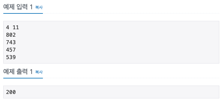 첫째 줄에는 오영식이 이미 가지고 있는 랜선의 개수 K, 그리고 필요한 랜선의 개수 N이 입력된다. K는 1이상 10,000이하의 정수이고, N은 1이상 1,000,000이하의 정수이다. 그리고 항상 K ≦ N 이다. 그