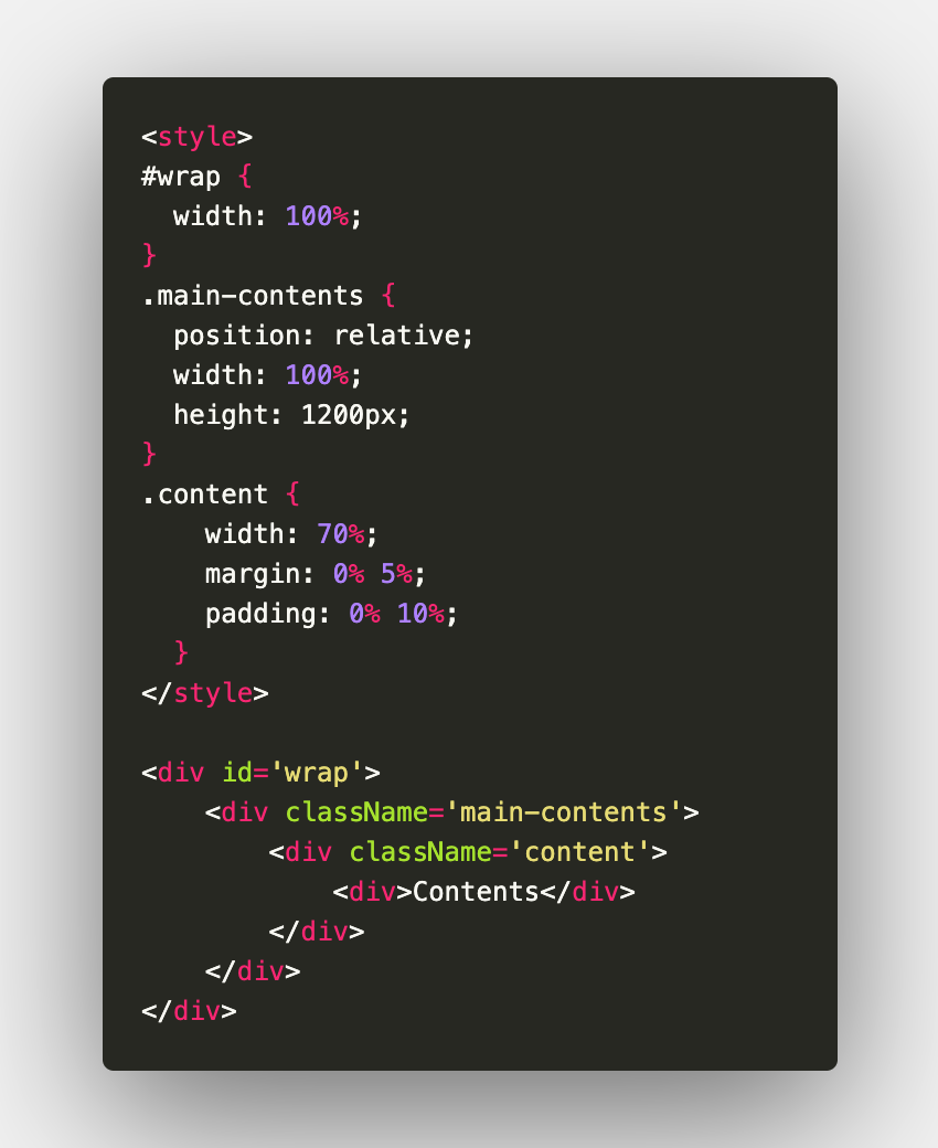 main-contents div 내에는 이제 검은색 박스로 둘러싸인 content div가 존재한다. 여기서 상위 요소인 main-contents의 width를 기반으로 가변 그리드의 너비, 마진과 패딩을 지정할 수 있다. 그림에서 설계한 대로 양쪽 마진과 패딩 값을 지정해주었고 너비를 나머지 길이로 만들어 주었다. 100%라는 상위 요소의 width 크기를 사용할 수 있는데 하위 요소에서는 해당 범위 내에서 원하는 크기를 상대적으로 지정하면 되는 것이다. 하위 요소의 width, 양쪽 마진/패딩 값을 모두 더했을 때, 100%가 되면 화면에 딱 맞는 형태로 요소를 작성할 수 있다.