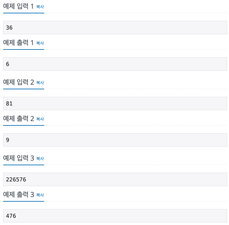 - 입력은 항상 제곱근이 정수가 되는 값이 주어지고, 이 N의 최대 길이는 800자리이다. 즉, 엄청나게 큰 수가 입력이 될 수 있다.