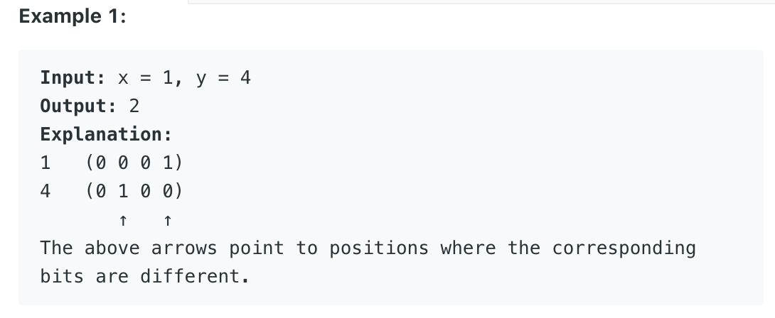 두 수를 XOR하게 되면 연산의 특징에 의해 서로 다른 자릿수에만 1이 등장하게 된다. 같은 경우는 0이 된다. 따라서 이 문제는 두 수를 이진수로 바꾸고 XOR 연산을 진행한 뒤 존재하는 1의 개수를 반환하면 된다.