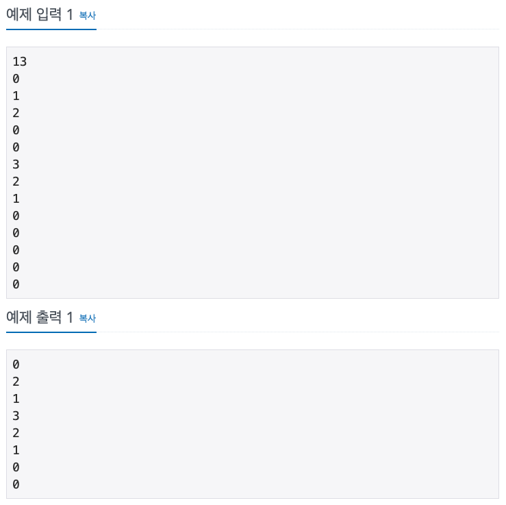 첫째 줄에 연산의 개수 N(1 ≤ N ≤ 100,000)이 주어진다. 다음 N개의 줄에는 연산에 대한 정보를 나타내는 정수 x가 주어진다. 만약 x가 자연수라면 배열에 x라는 값을 넣는(추가하는) 연산이고, x가