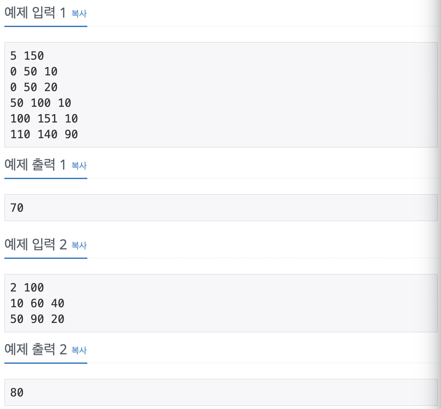 첫째 줄에 지름길의 개수 N과 고속도로의 길이 D가 주어진다. N은 12 이하인 양의 정수이고, D는 10,000보다 작거나 같은 자연수이다. 다음 N개의 줄에 지름길의 시작 위치, 도착 위치, 지름길의 길이