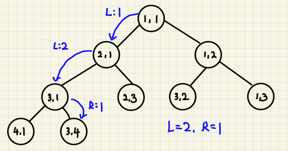 [그림 1]에서 확인할 수 있는 예시에 따르면 (3, 4)인 노드에 방문하기 위해서는 왼쪽으로 2번, 오른쪽으로 1번 이동해야 한다고 되어 있다. 이를 확인하기 위해서는 문제에서 주어진 트리 구성 규칙에 따라서 트리를 직접 그려보면 이해에 도움이 된다.