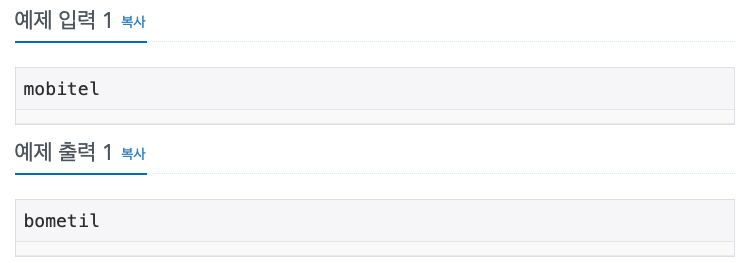 예시 1 :: 주어진 단어 mobitel을 세 부분으로 나눠서 다시 조합한 문자열 중 가장 작은 경우인 bometil을 출력하였다.