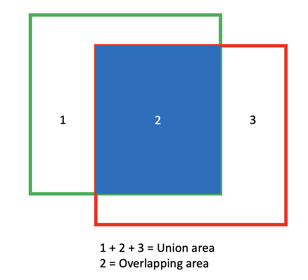 - 실제 객체가 존재하는 박스와 모델이 객체라고 인식한 박스가 얼마나 차이 나는지를 표현한 값이다. [수식 1]과 같이 정의할 수 있으며 이를 그림으로 표현하면 [그림 1]과 같이 표현할 수 있다.
