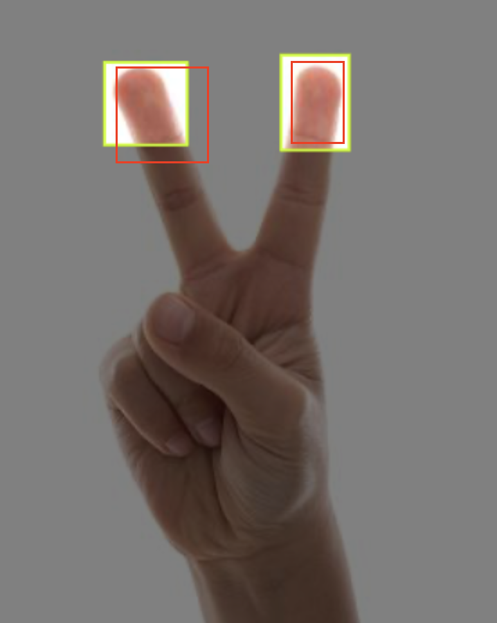 [그림 2]를 예시를 들어 살펴보자. 초록색 박스는 GT 박스이고, 빨간색 박스는 학습된 모델이 손가락 끝이라고 인식한 범위인 infered 박스이다. Object detection(또는 Semantic segmentation)에서는 IoU 값이 1에 가까울수록 좋은 성능을 가졌다고 평가한다. IoU 값이 1에 가깝다는 뜻은 두 박스 사이의 겹치는 영역이 크다는 뜻과 두 박스가 일치한다는 뜻과 일맥상통한다. 평가 이미지의 GT 박스 정보와 모델을 통해 얻어낸 박스 정보를 활용하면 IoU를 계산할 수 있다. 그렇다면 mIoU는 무엇일까?