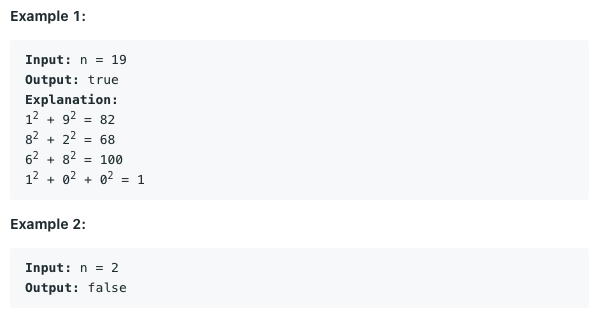 - 1 : 각 자리수의 제곱을 더하여 happy인지 판별할 숫자를 만드는 것이다. 주어진 입력을 문자열로 만들어 각 자리수에 접근한 후, 다시 숫자로 변환하며 제곱하여 더한다.