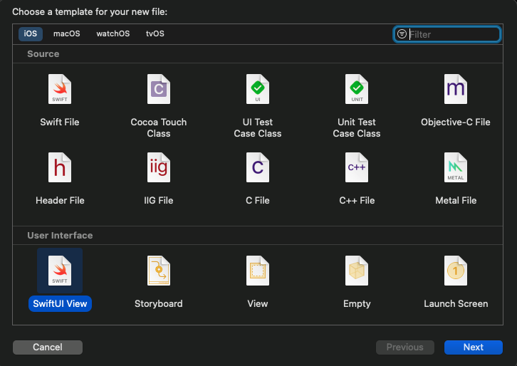 우선, MapView를 새롭게 만들어주저야 한다. Xcode 상에서 cmd + n 버튼을 조합하여 새로운 파일을 생성한다. 이때, SwiftUI를 사용하기 위해서는 User Interface의 SwiftUI View를 만들어주어야 한다.