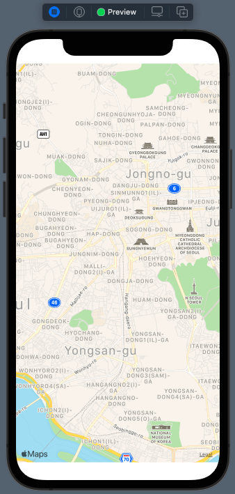 작성한 region 변수를 사용하여 지도 객체를 View에 포함시킨다. 이 때, 변수 앞에 `$`가 붙는다. 이 `$`가 붙는 이유는 만든 지도 객체에 사용자 상호작용을 반영하도록 하기 위해서이다. $를 통해 해당 지역을 바인딩하여, 사용자가 지도에서 이동하고, 줌인/아웃하는 기능을 실시간으로 할 수 있도록 한다. 그리고 `MKCoordinateRegion` 자체에서 바인딩된 변수를 필요로 하기 때문에 $를 붙이지 않을 경우 에러가 발생한다.
