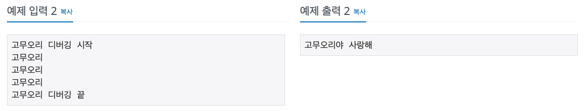 - 예제 입력 1에서는 (문제 - 고무오리), (문제, 문제 - 고무오리, 고무오리) 이렇게 모든 문제를 해결할 수 있기 때문에 '고무오리야 사랑해'를 출력하였다.
